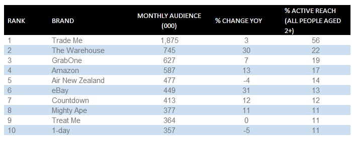Trade Me is the top commerce site, reaching 56 percent of the population and had 1.9 million unique monthly visitors. The Warehouse, in second place had strong growth year on year and now reaches 22 percent of New Zealanders and 750,000 unique monthly visitors. GrabOne, Amazon reach 19 percent and 17 percent of the population respectively and attract 630,000 and 590,000 monthly visitors to their websites. Air New Zealand, eBay, Countdown, Mighty Ape, Treat Me and 1-day make up the top 10 e-commerce sites for New Zealanders to visit.