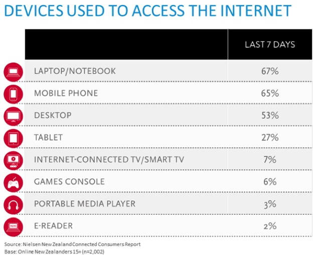 Nielsen’s New Zealand Connected Consumer Report revealed 70% of online New Zealanders own a mobile device. More than two thirds (64%) own a smartphone and 33% own a tablet device. More than a quarter own both a tablet and a smartphone, a fivefold increase since 2012.