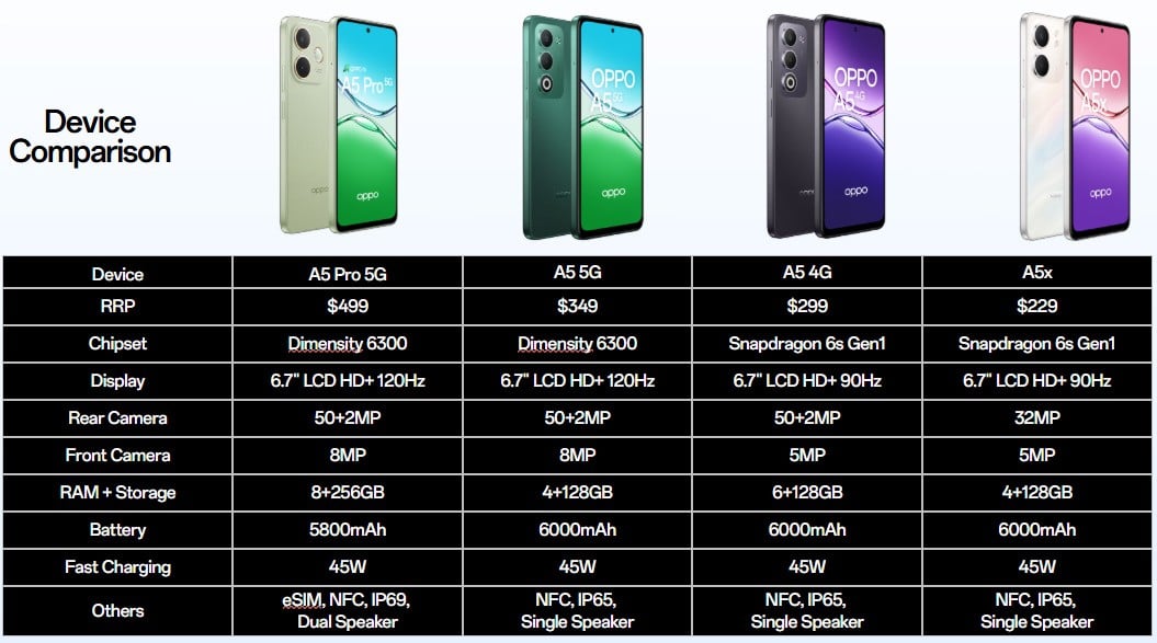 Some of highlights include IP65 (IP69 on A5 Pro 5G model) water and dust resistance, 6,000mAh battery with 45W SUPERVOOC Flash Charging and five years of OS updates plus six years of security patches.