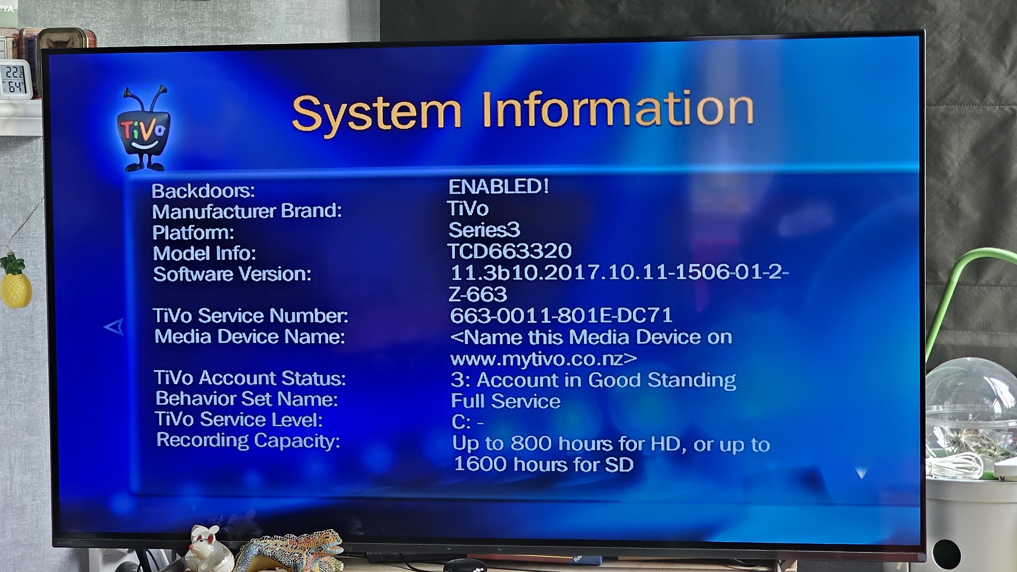 - Fully working TiVo with upgraded drive (I think it's 2TB, system info shows 800 hours HD storage).