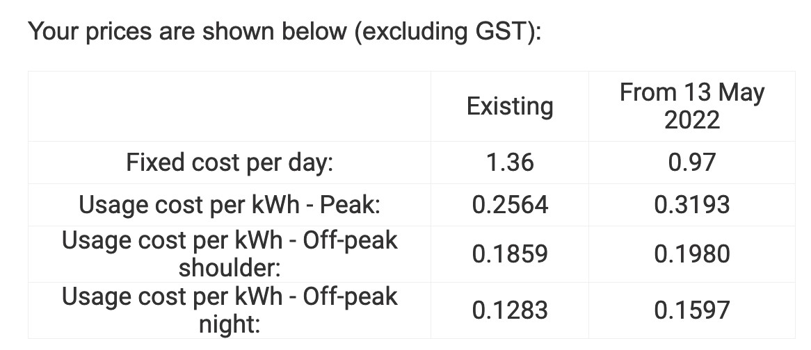 With the increases, peak and night are both up 5.1%; shoulder up 17.7%; I should be back at work in a few weeks instead of fulltime WFH, so the impact of that significant rise in shoulder charges shouldn't be too great in the end.