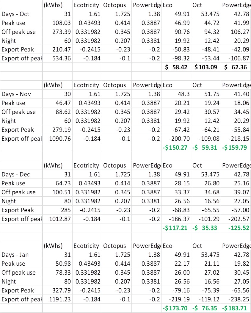 In Palmy Nth, 9.6Kw system, 22 panels, 10Kw bty, was with Genesis, changed to PowerEdge, fixed for 3 years, only been 5 months and now $600 in credit. Should be enough to see us through winter to turn on the underfloor heating. Gas hot water, hobs and fire .