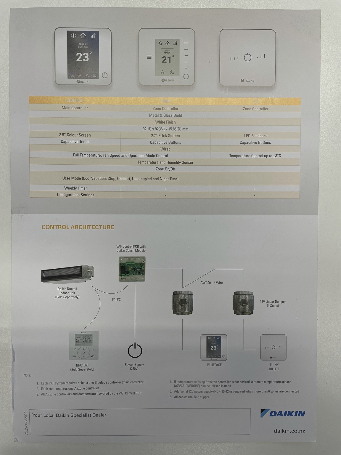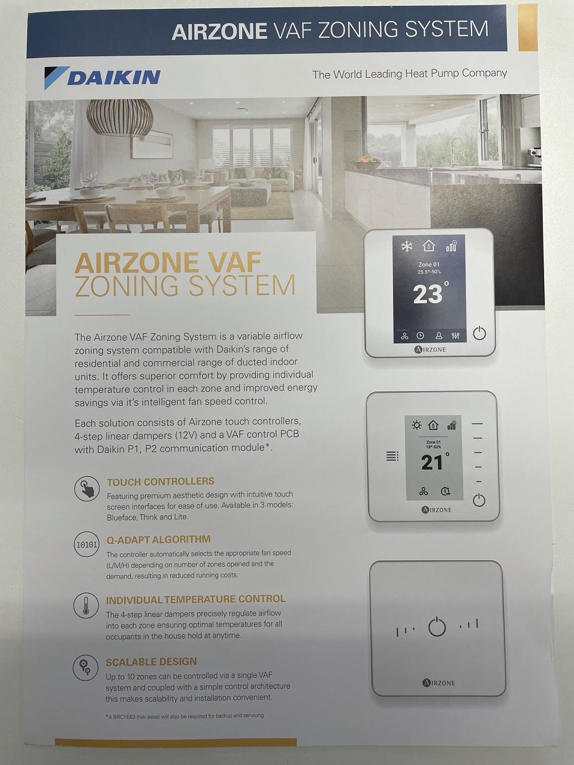 timmmay:Kickinbac: Daikin is now selling this as an option on their ducted systems. Was looking at the brochure yesterday. There is an interface unit that allows the airtouch to control the daikin indoor unit fan speeds. So if the zones turn down the fan speed reduces. This has been a common problem with zone control systems as there was no interface between the dampers and the fan.The Daikin brochure I've seen from Dec 2020 has "Airzone VAF Zoning System". I asked two air con sales guy about it, they both said "never used it, have to talk to Daikin". After talking to Daikin they said "Daikin don't think it's very good. It can only control room temperature within 4 degrees". I asked "So, you set it to 22, the room can be 26", he said "yep".