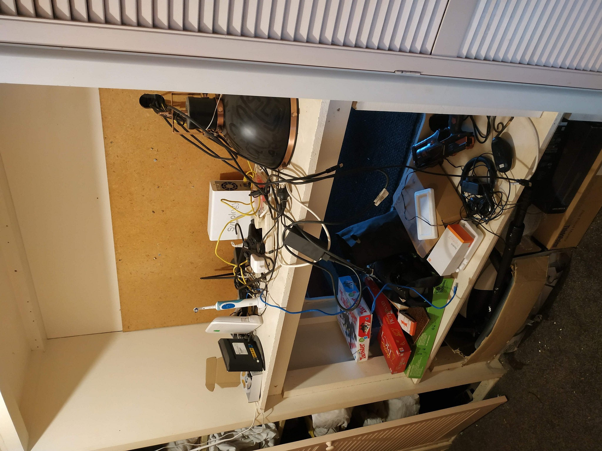 For starters, consolidate all the wall warts, it looks like you've got USB power there and presumably some 12V as well, replace all the 12V ones with a single Meanwell 12V power brick and all the USB ones with a single good-quality multi-outlet USB power block like an Anker. Once you're reduced the 4+ wall warts to one or two you can look at the other cables. Firstly, replace the UK power plug and adapter with a NZ one to make it NZ-legal. Then get rid of anything that's not used, e.g. the unplugged white wall wart bottom left. Then post an updated photo of what's left for further comment...