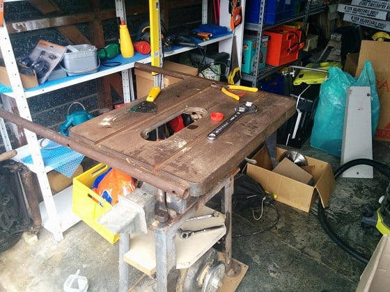 My 1950 Tanner table saw, inherited from my grandpa via both my dad and uncle. Neither of the latter two did any upkeep on it, so this was the state I received it in (yes, I had already started pulling it apart when I remembered I should take a photo):