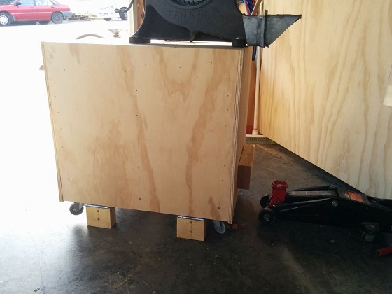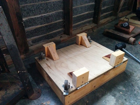 I was originally going to put it on castors, but then got a bit nervous about the amount of weight that would be sitting on it (it weighs a tonne). But how to make some kind of jacking mechanism? To the internet! 3 hours of over-elaborate youtube videos later, decided on something a little simpler. Hinged legs, and a place to put a car trolley jack under. Jack it up, flip the legs up and down. It's not perfect (the legs can flop and get caught if you're not careful), but actually quite pleased with how well this works: