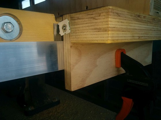 The Plan A version had a homebrew bolt with a fingernut starwheel on it to tighten it square. This took heaps of faffing around and didn't work in the end anyway. $6 clamp? Quicker. Easier. Cheaper. Truer. Again, kind of wish I had thought of this sooner: