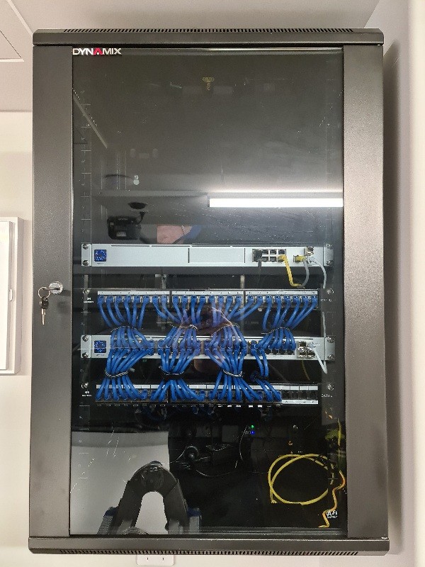 Good question about taking down the cabinet. It's an 18RU 600mm cabinet bolted (4 bolts) by the builders into extra blocking placed inside the wall. It'd be possible for a few strong people to remove together but something we'd really prefer not to try since there's such an easy work around to the heat problem (remove the cabinet door).