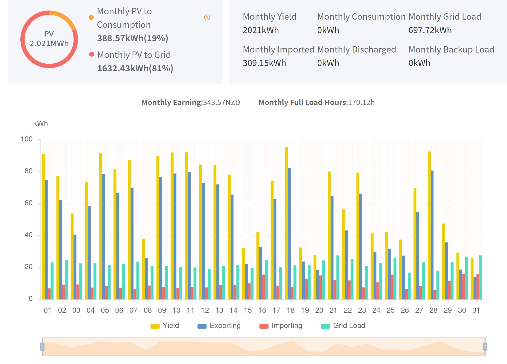 Anyway, yesterday was an epic solar day here in Christchurch. Total PV generation was 91.7kWh (from a 10kW inverter), and 78kWh was exported at 17 cents per unit. That's over $13 in credits.