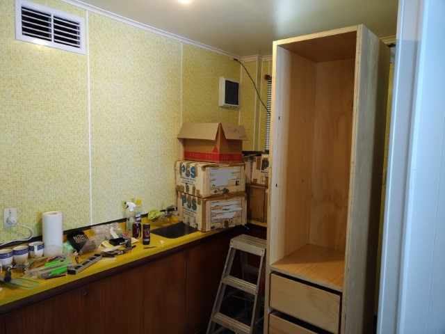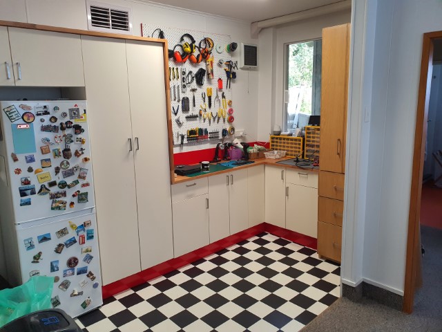 Quite a lot of time, but only cost a few hundred dollars, and most of that was for the new beech fingerjointed countertops. And additional pegboard hooks and plier holders. Kitchen cabinetry was salvaged from a demolition and made to fit, new handles were on sale, paint and lino was leftovers from other things.
