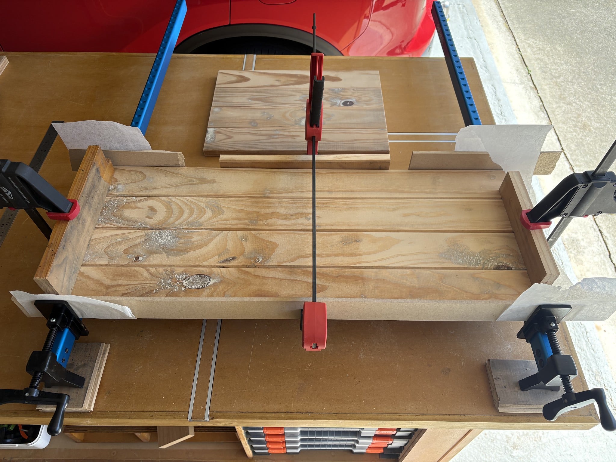 I didn't use anything to stop the clamping boards sticking to the inside faces as the ends will be covered with the corner posts.