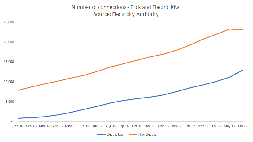 Electricity Authority retail connection data is out for June - very interesting to see that Flick has barely lost customers, just levelled off it's strong growth trend. EK has grown by a similar amount to Flick's loss, but again nothing spectacular. Just a few geeks switching, I guess!