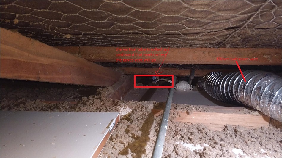 My thought was to bend about a 1m length of 250 mm ducting into a rectangular 305 x 90 shape pass it through the narrow area and then pull it out a 250mm hole in the soffit and attach a 250mm round vent.
