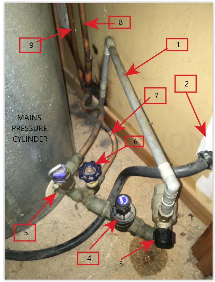8. Cold Pipe, coming out of the top of the cylinder and draining down to outside