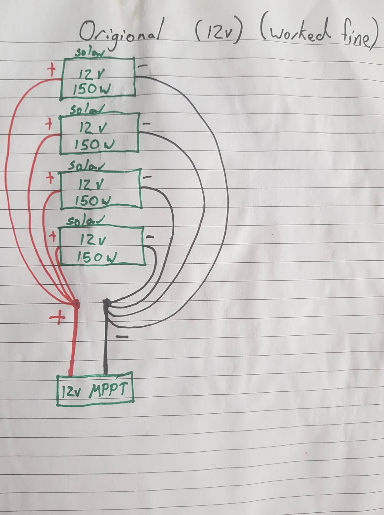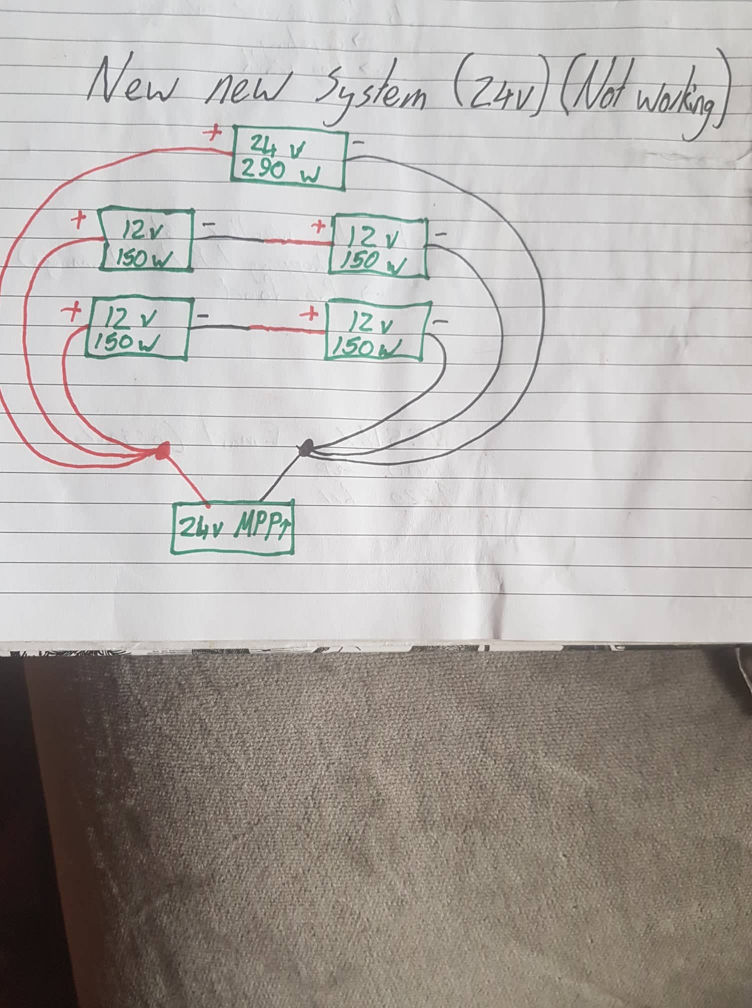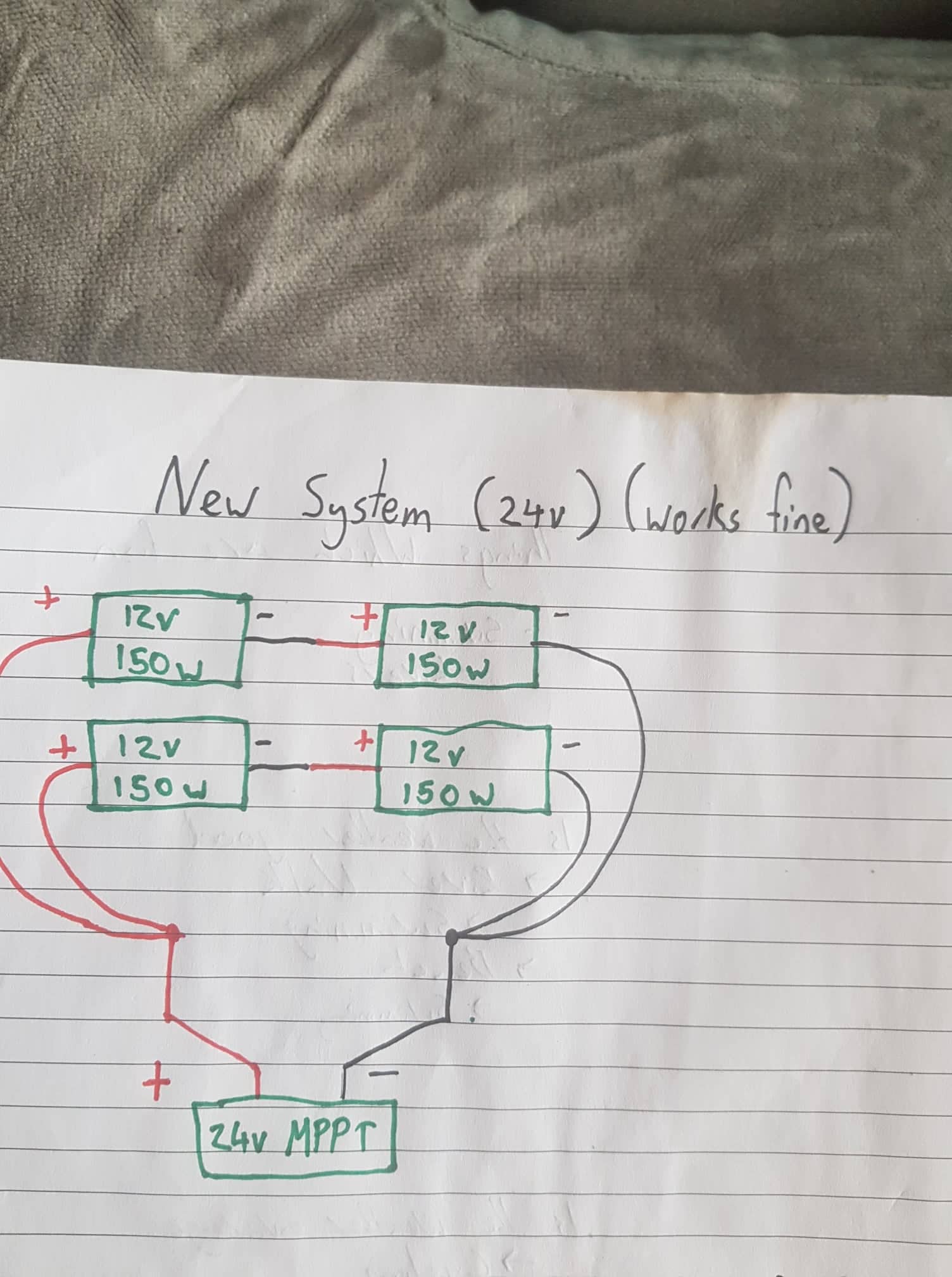 I have an off grid powered house powered by 6 x 12v batteries all hooked up in parallel. I also have 4 x 150w 12v solar panels all hooked up in parallel too. Things were good however I decided to move up to 24v. I rewired the batteries so that they were now in three pairs so they were 24v. I did the same with the solar panels, putting them into two pairs so they were also 24v.