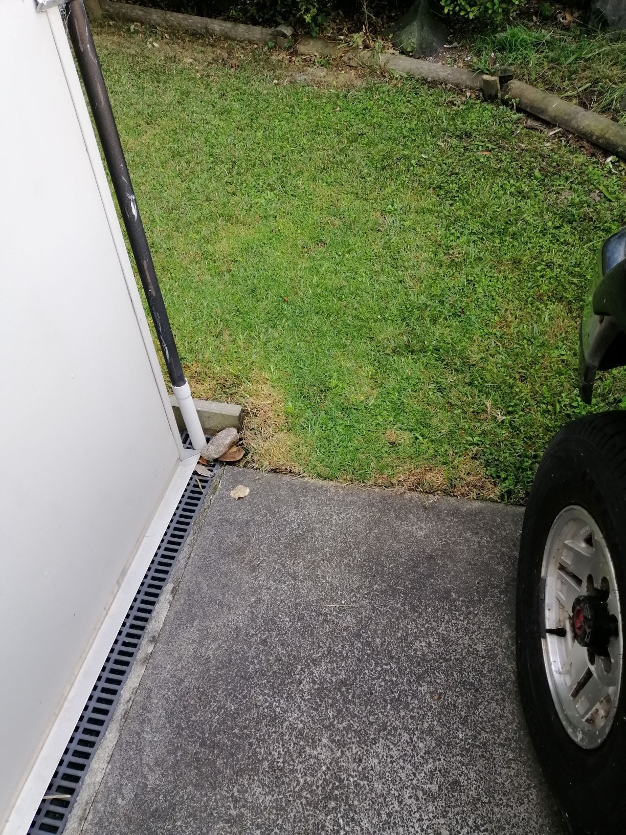 Below is the end where the fence meets the house. I want to have one of the gates hinged here. I was thinking of using a post and bearer bracket like the B25 bowmac bracket with dynabolts into the concrete and tieing the top of the post into the house for support. The reason I don't want to dig a hole for it is one, there is a drainage pipe running in front of the concrete slab, and two it won't meet up with the house as nicely.