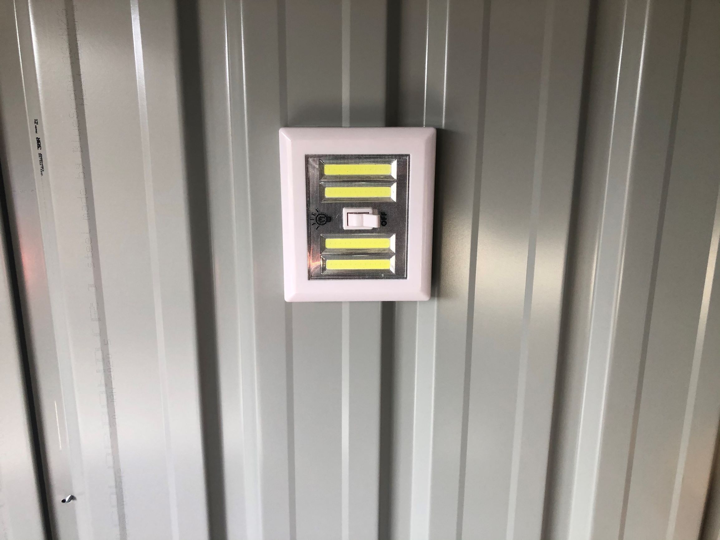 The close up photo is of a battery (2 x AAA) powered COB-LED lights I bought from M10. These have magnets on the back so they attach themselves to the wall/roof of the shed. Very handy little lights.