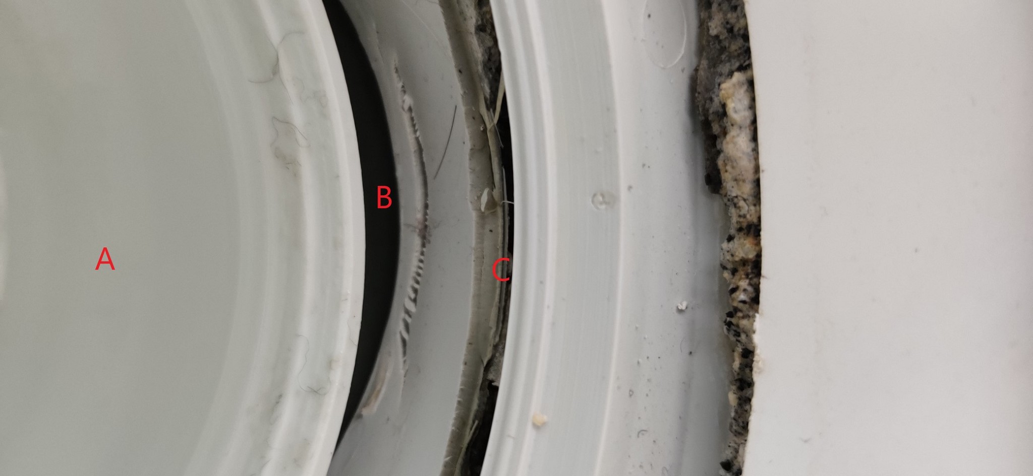 Looking closer I saw cracking in the plastic. Looking even closer I saw that the plastic had been ripped apart. In the bottom photo there should not be a gap where C is. As far as I can tell B is another inlet to this drain, from the sink. There is also a draught coming up from the drain.