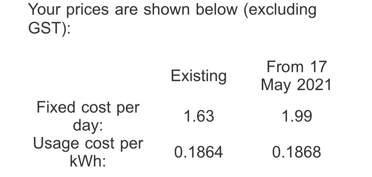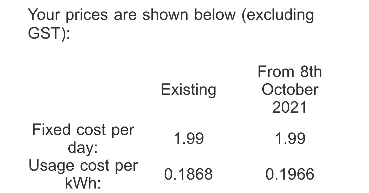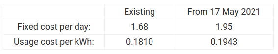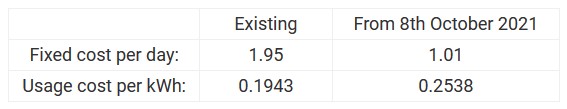Existing From 8th October 2021 Fixed cost per day: 0.32 0.32 Usage cost per kWh: 0.2437