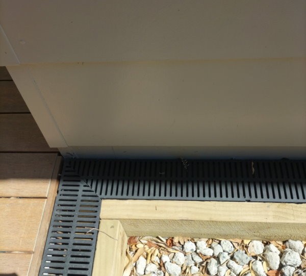 The idea was to put an elbow on it, run it through the wooden retaining wall timber and then under the crushed-concrete scoria on the other side. It can't run under the grating because there's supports and posts in the way.