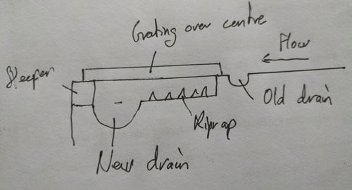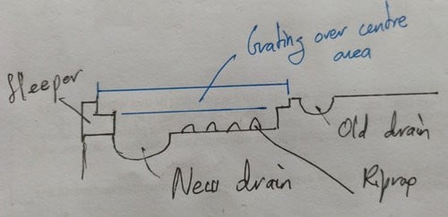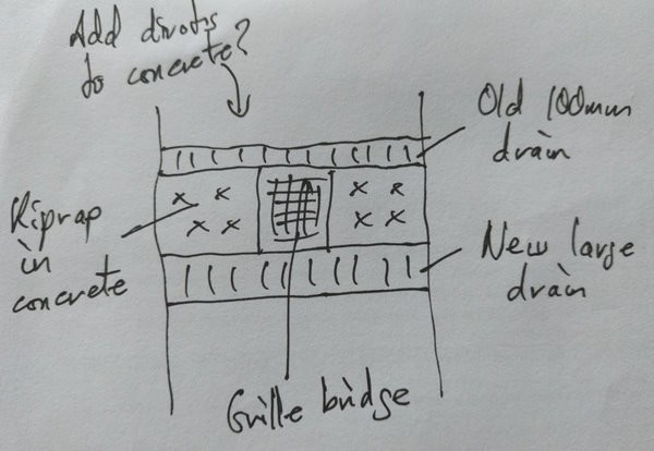 So it'd need riprap or something functionality equivalent to slow down/break up the flow and let it drop into the two drains, problem is we still need to get down to the house. One idea is to have, behind the old original channel drain, maybe half a metre of riprap in concrete, which also provides a surround for the water meter box, followed by the new, larger drain, and a galvanised grille over the centre to allow water down onto the riprap and drain but still allow foot traffic over the top: