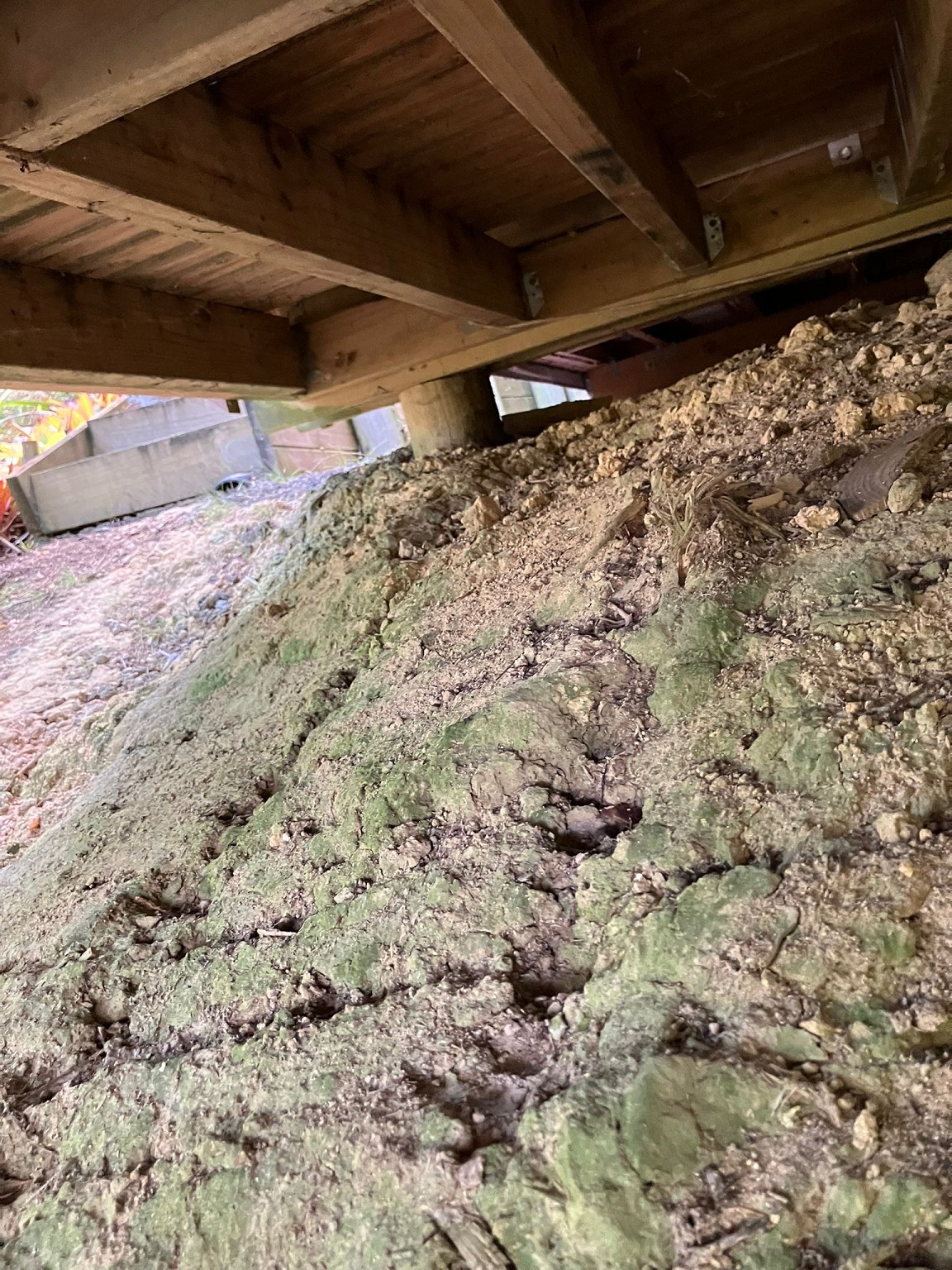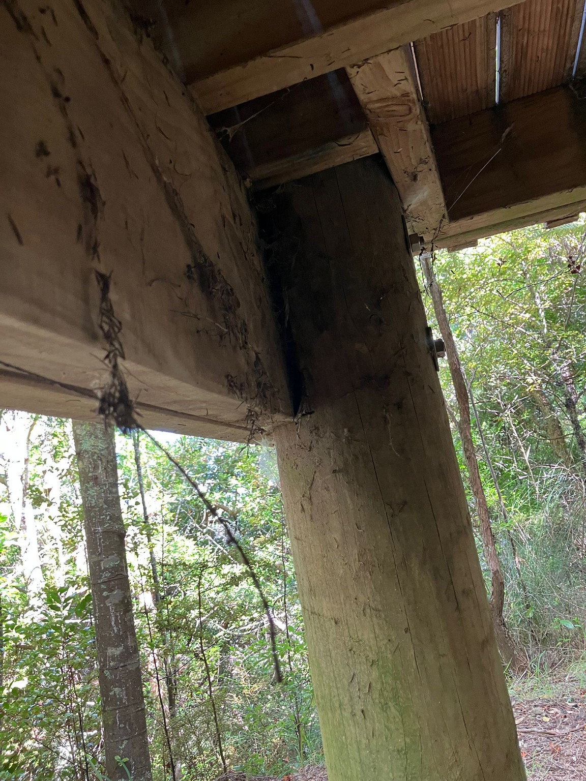 The deck was professionally installed by the builder when the house was built. The house is on poles. The deck has bearers front and back, doubled up, where one of each is partially cut into the house poles, and both bearers bolted through. See the pics.