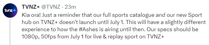 TVNZ state that the sports hub on TVNZ+ will arrive on July 1st (Saturday), and a previous post states that they have been in touch with TVNZ who said that the sports hub will deliver 1080p Full HD on the hub, and 720p on TV1 and Duke. So, hopefully we will get FHD when the hub is up and running.