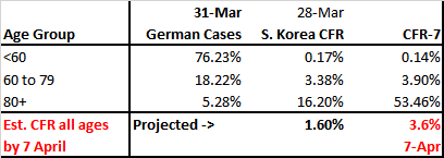 Based on their current (31 Mar) age profile, the table below forecasts a likely jump in the overall CFR for Germany from its current 2% to about 3.6% by 7 April ... Time will tell?