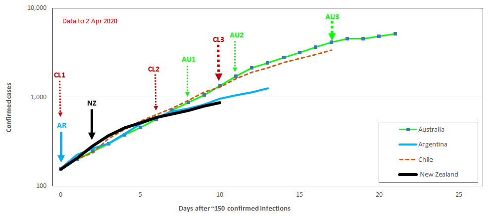 Noticeable that the two with 'full' lockdowns (AR & NZ) implemented at an earlier stage show quicker roll off from exponential growth. And both following a fairly similar trend. Not certain the lockdowns (11 & 8 days ago) will have kicked in much so far. Hopefully will see bigger effect over the next several days. Perhaps so far the earlier stage has been a more important factor?