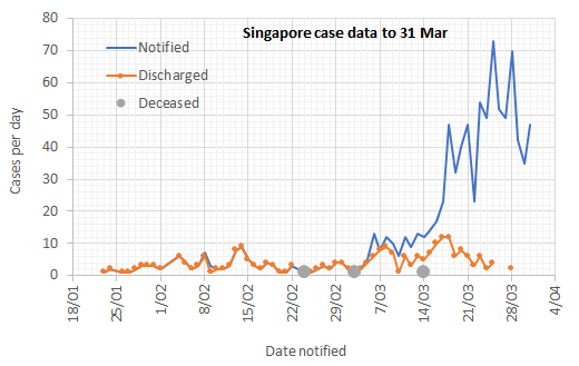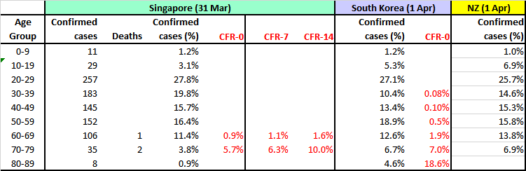 CFR: with only three deaths the Singapore data are not reliable in this respect but they are surprisingly not that different from the latest data for South Korea (which have been creeping up, esp for 80+). This is one area where having actual case by case data (per Singapore) is important as most summarised age dependent CFR data (per South Korea) ignore the lag between exposure and death (ie. are CFR-0 values). Being still in near exponential growth in cases CFR-0 is not good for forecasting / modelling. No way this type of info will be able to be extracted from the NZ data (with only 1 death not relevant at this point though).