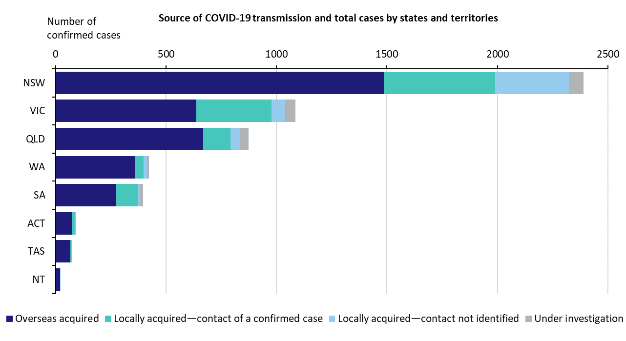 On the theme of cases imported, plot below is Australian data from https://www.health.gov.au/sites/default/files/documents/2020/04/covid-19-cases-in-australia-by-state-and-source-of-transmission-covid-19-cases-in-australia-by-state-and-source-of-transmission_2.png