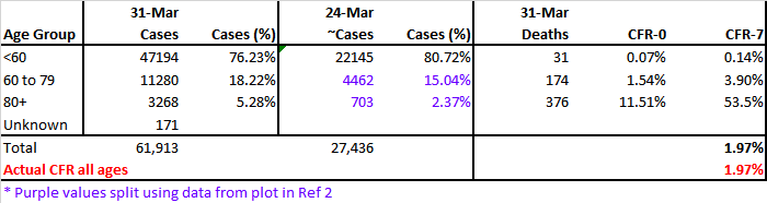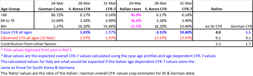 As per the second table above, the South Korean data do not well explain the observed overall CFR-7 value for German cases as at 31 Mar. Nevertheless, the ratios calculated for the impact of the difference between the age profiles of Italian & German cases are not that different for SK & German CFR's, indicating that the estimates of relative contributions of age profile discrepancy and overwhelmed hospitals in Italy are reasonably robust (or at least not highly sensitive to the CFR for the 80+ age group).