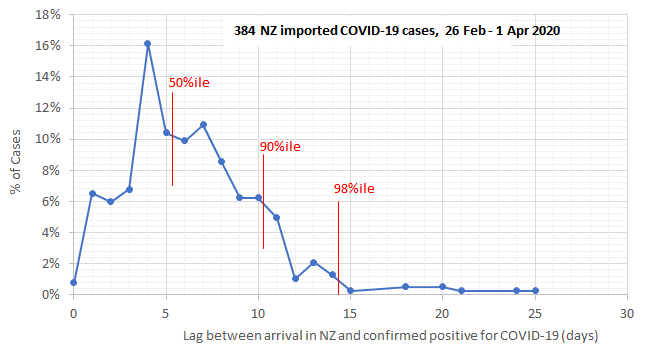 Plot below for NZ data imported cases to 1 April. Shows distribution of lag time between arrival in NZ until positive test result reported by MOH. Should in theory provide a lower bound estimate of lag from infection to test confirmation being reported by MOH.