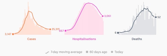 The relative effectiveness against symptomatic disease 14-34 days after a BNT162b2 or mRNA-1273 (Moderna) booster after a ChAdOx1-S (Astrazeneca) and BNT162b2 as a primary course ranged from around 85 to 95%. Absolute VE ranged from 94-97% and was similar in all age groups. Limited waning was seen 10+ weeks after the booster. Against hospitalisation or death absolute effectiveness of a BNT162b2 booster ranged from around 97% to 99% in all age groups irrespective of the primary course with no evidence of waning up to 10 weeks.