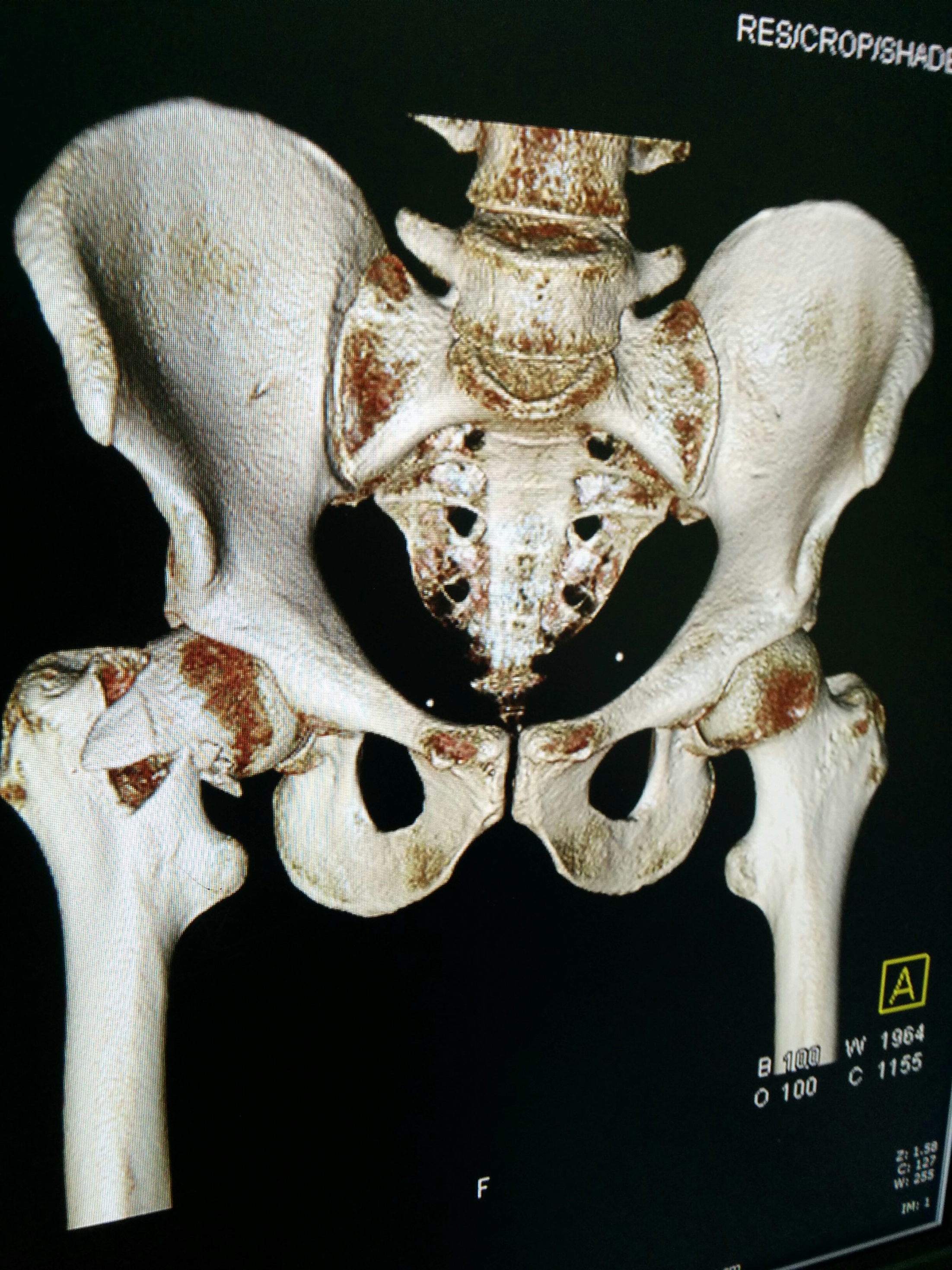 ajobbins: Just over a year ago I broke the subcapital neck of my right femur in a motorbike accident (3D CT render here if you're interested). I took myself to hospital in an Uber (An ambulance seemed dramatic) and sat in ER for 2 hours before then Xray'd me. No pain relief (It hurt, but wasn't enough to make me demand relief). The triage nurse came and apologised to me shortly after (with some pain relief) after they realised how injured I was (At this point they were trying to wake up the on call orth surgeon for my emergency surgery).