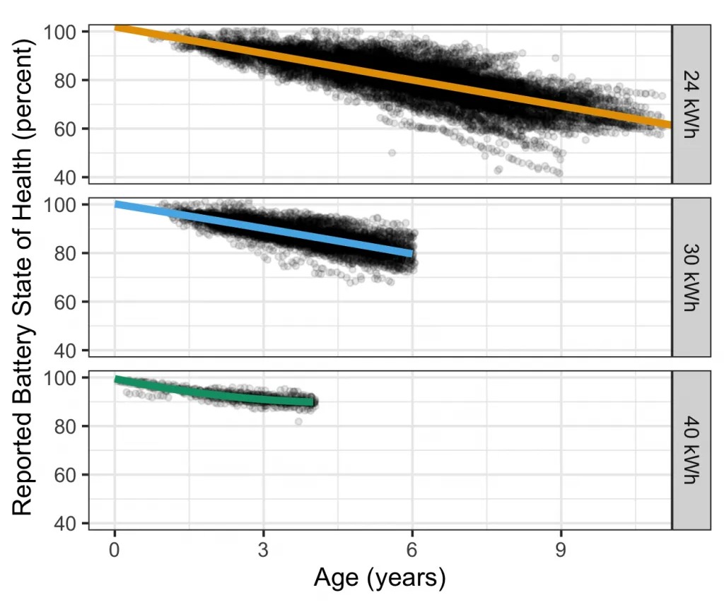 Mine is a 2014. My battery health is around 70 - 75%. This is in the bottom 5% of 2014 cars, likely due to the 1000+ fast charges the car has had. Degradation seems to be pretty linear based on flip the fleet data (concave up for the 40kWh pack). I am expecting another roughly 7-8 years running before the car drops below 45% or so health, which I view as end of life for the vehicle.