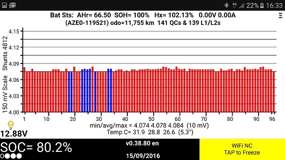 This is a screenshot of my Screen 1 in LeafSpy. This was yesterday morning. I'd just fast-charged from 16% to 81% at a nearby fast charger. The modules are in red because they are re-balancing and power is moving around. This screen shows all 96 batteries contained in the 48 physical modules. They should all be roughly the same. If one or more is a LOT higher or lower, then it may indicate a problem battery or module. The display here is fairly normal. There are fluctuations, especially if you are watching in real-time as you as AC charge. Of course the car is off when DC charging so you can't see anything.