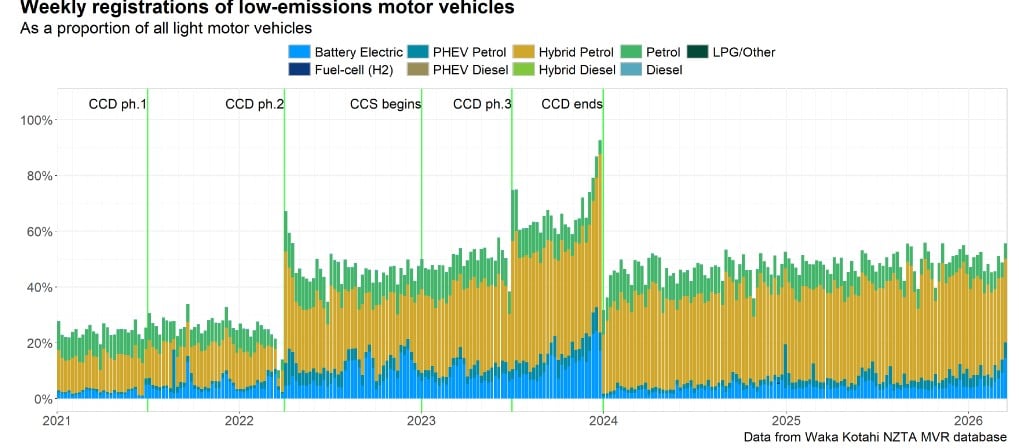 There is a definite uptick in the share of BEV (light blue). but we're still not near the highs of end of the CCD in the last weeks of 2023