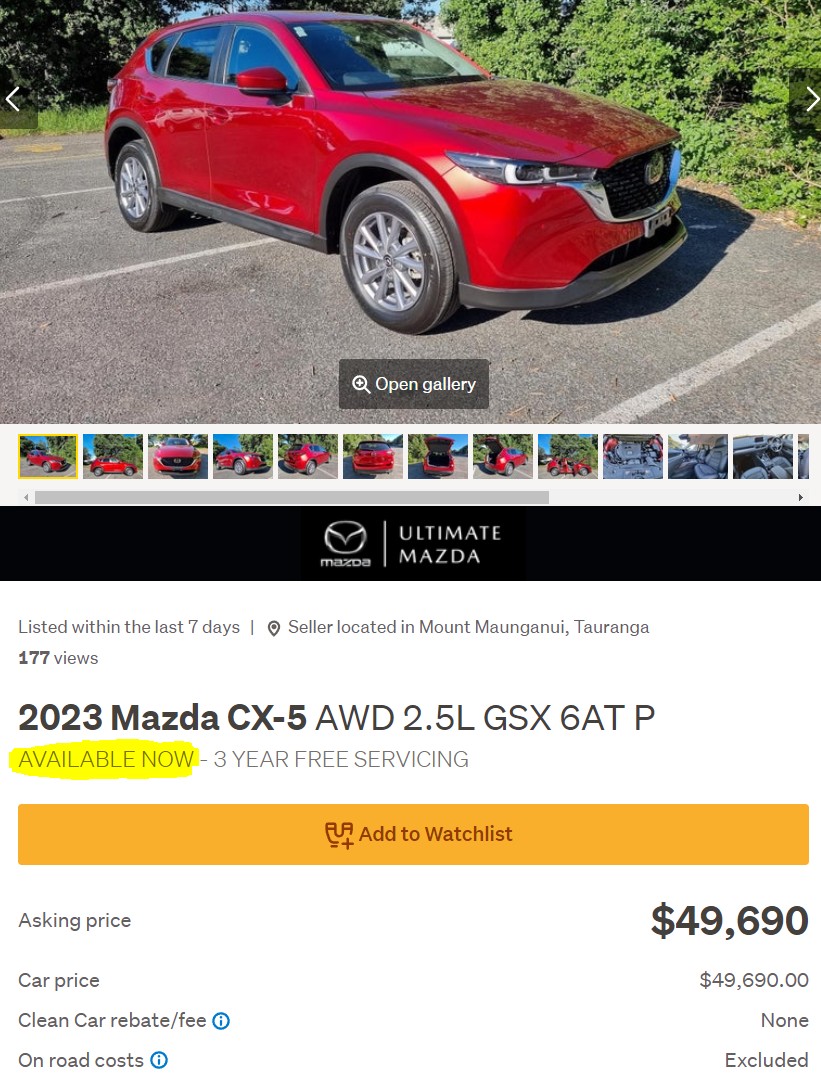 But yes it is a one off blip. Mazda NZ could stop future CX-5 AWD orders from their parent, and just sell what turns up from existing orders at a slower rate as they do now. (and it might even be much different, all the competitors on the list are about to jump in price too.). Storage costs are fairly low.