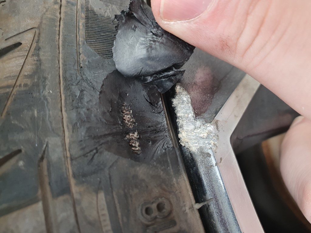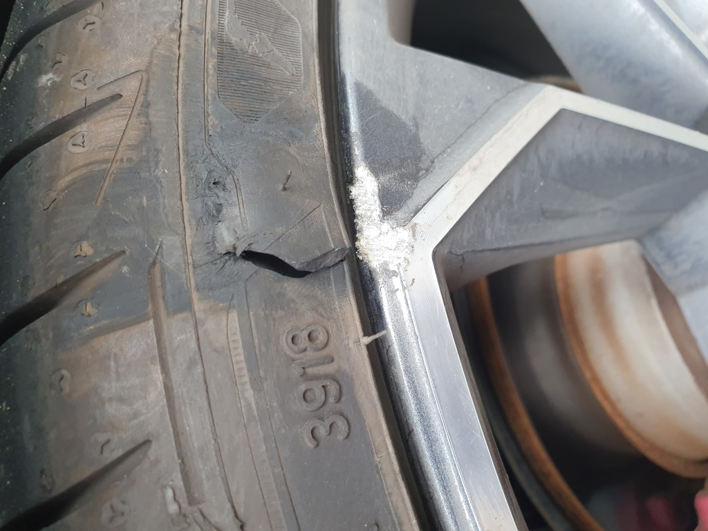 On later inspection I found I had dinged my alloy (again. Sheesh) and taken a flap out of the side wall of the tyre at the point where it meets the rim. The flap of rubber has held on to the tyre and the overall size of the damage would be slightly bigger than a $2 coin but irregular in both shape and depth.