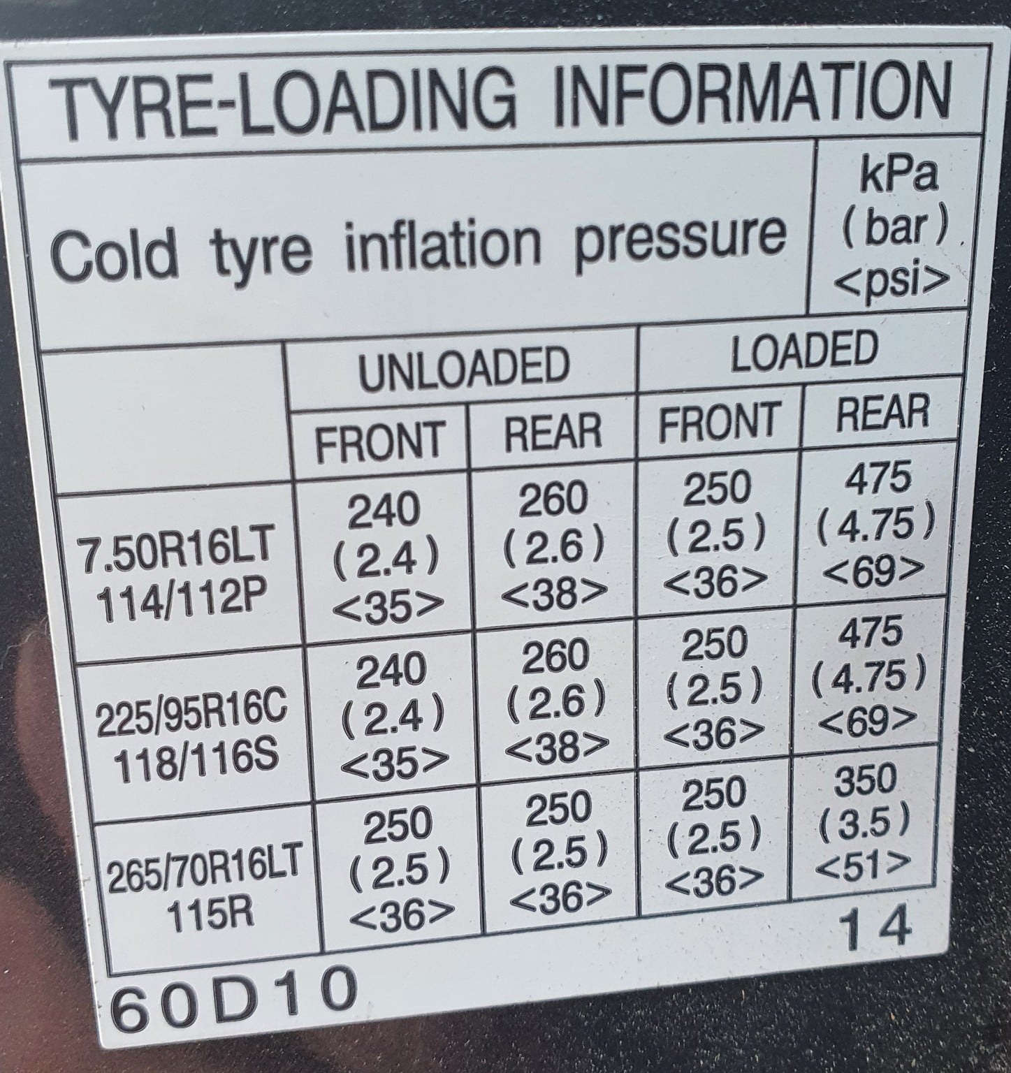 Just wondering what the tire pressure should be for my Toyota Hi Ace 2015 campervan, with a high top. Manual says 51 psi front, for back it's 51 psi (no 5th seat), 58 psi with 5th seat.