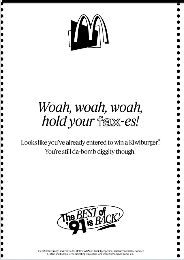 Send in a fax containing the word “Kiwi” to +64-9-281-4506 to claim your free Kiwiburger voucher. Only the first 5,000 unique faxes sent in will receive, via a fax reply, the voucher QR code to redeem a free Kiwiburger. Only one fax number per entrant shall be eligible for the promotion. Overseas fax numbers not accepted, including online fax generators that may use an overseas fax number.
