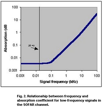 So while low frequencies can travel >1000 km in the SOFAR channel, it seems unlikely ultrasonic will get very far (scale is dB/km).