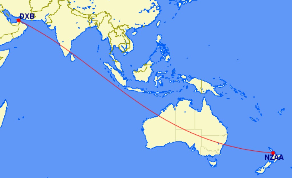 We have some rellies on Emirates EK449 which left Auckland for Dubai around 8:30 pm tonight. We have done this flight many times and it has always flown ~NW across the Tasman to cross Australia over Brisbane.
