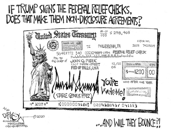WASHINGTON (The Borowitz Report)—Donald J. Trump vehemently defended his decision to have his name printed on the millions of I.R.S. checks being issued to the American people, telling reporters on Wednesday, “I want my name to be synonymous with the coronavirus.”