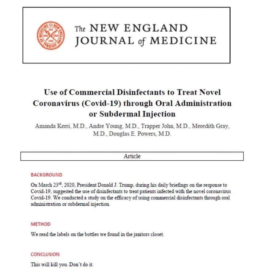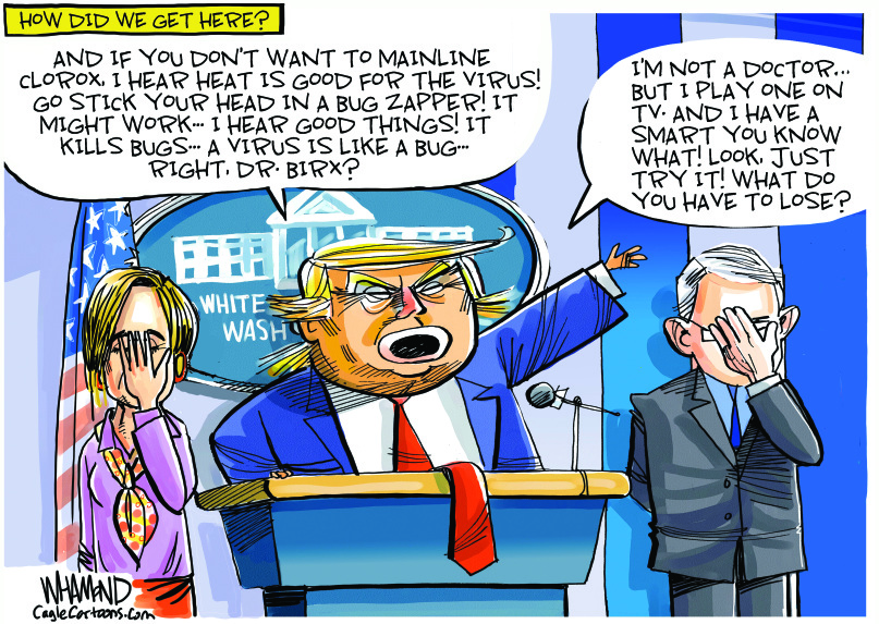 Recent discoveries are revealing that the Corona 19 virus is even more dangerous than first realised, and there are possibly added dangers that have not yet emerged. We may only be seeing the tip of the iceberg. This thing could come back again and again, killing people of all ages in currently unsuspected ways. Trump is a clear and present danger to his country and the world. Those who know better have to quit biting their tongues and sitting in polite silence while he raves. The time for polite silence is over. If there is to be a post-virus America at all, the entire cabinet needs to stand up and frog-march this lunatic out of the room.
