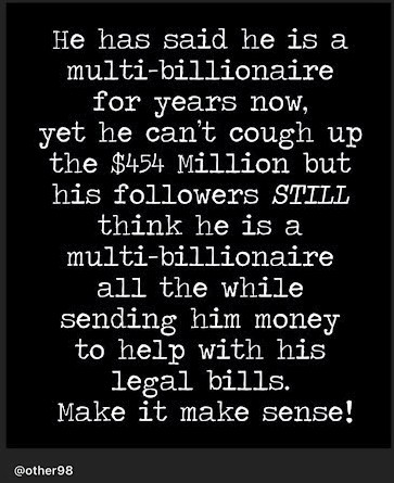 Seriously, if he really just has all this money lying around doing nothing (like the Newsmax guy - rightfully - asked her), what's the issue? Should be no problem for Trump just to write a cheque to get his appeal underway, right? 😃