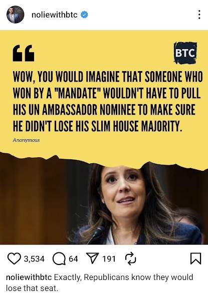 and Elise Stefanik who was all set to become the orange buffoon's UN Ambassador has her nomination pulled: https://www.axios.com/2025/03/28/elise-stefanik-mike-johnson-trump-un-ambassador