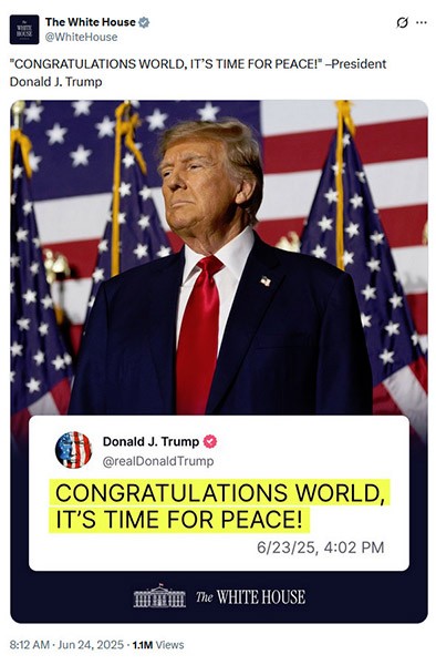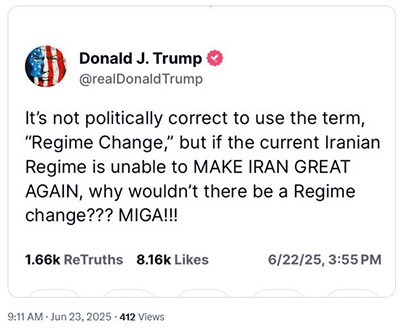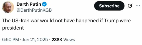 That aged well: https://www.axios.com/2025/06/23/trump-iran-israel-ceasefire 🙄