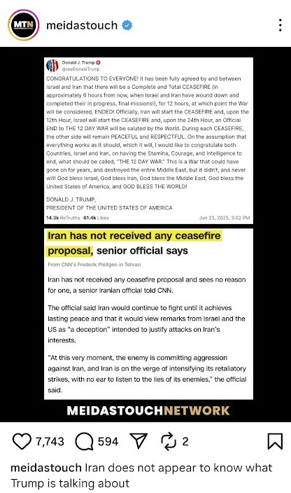 Also - the orange buffoon may have announced a "ceasefire" between Iran and Israel...but Iran says otherwise: